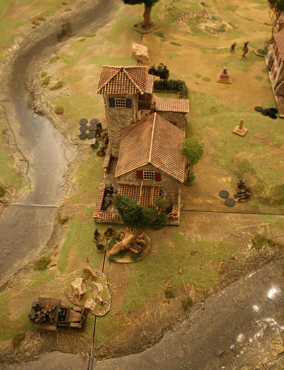The remaining German forces gathered around the rear building at the ford. They held it occupied with a squad an the machine gun team, positioned the SdKfz. nearby and let the spotter initiate mortar fire on the unlucky American squad between the cottages.